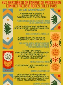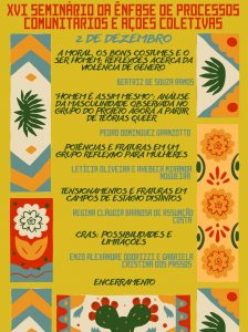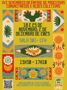 Convidamos a comunidade universitária e demais interessados, comunidade externa, família e amigos, para apreciar o XVI Seminário da Ênfase Processos Comunitário e Ações Coletivas, apresentação das/os estudantes que estão finalizando a atividade de estágio na ênfase D.
